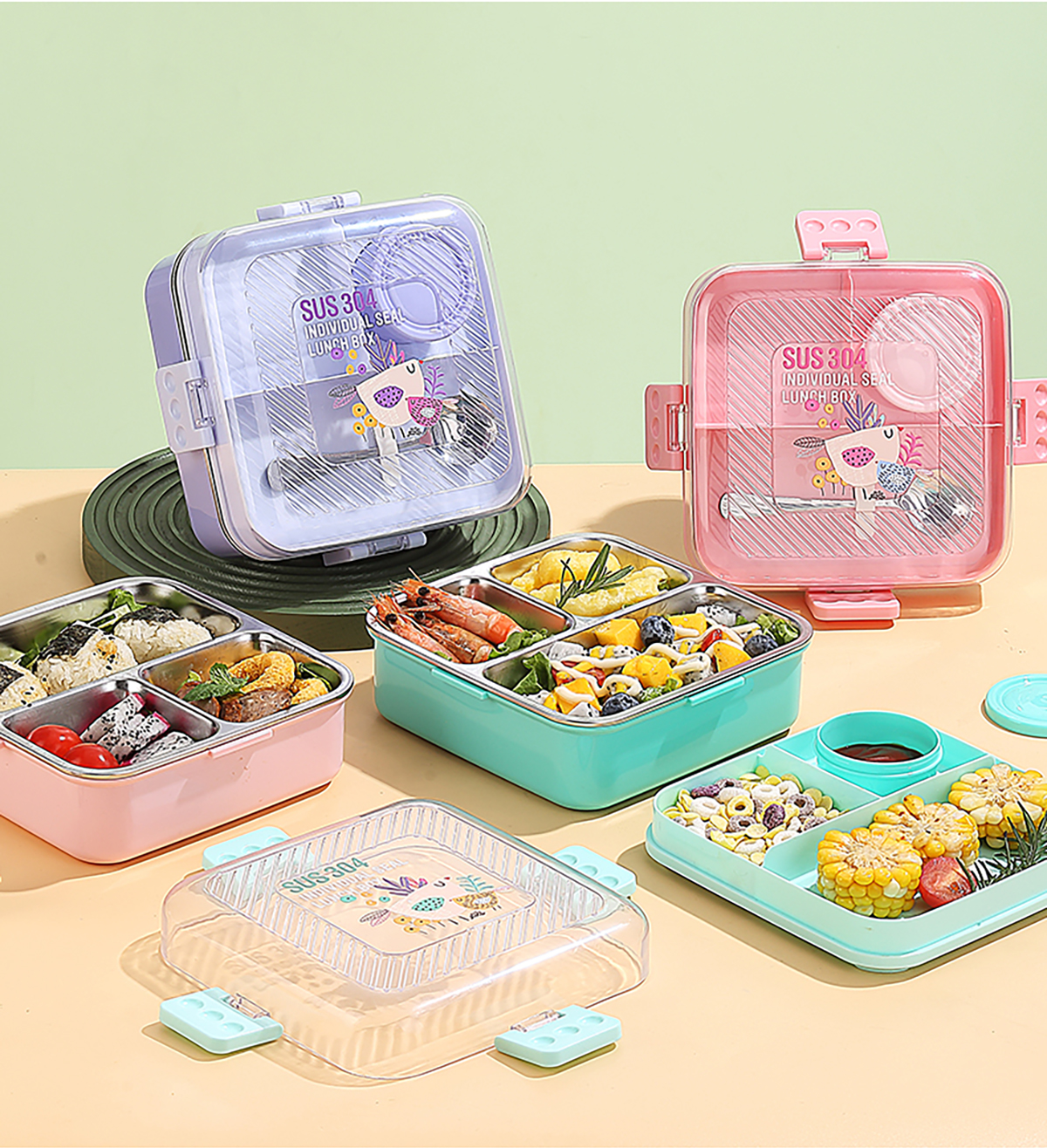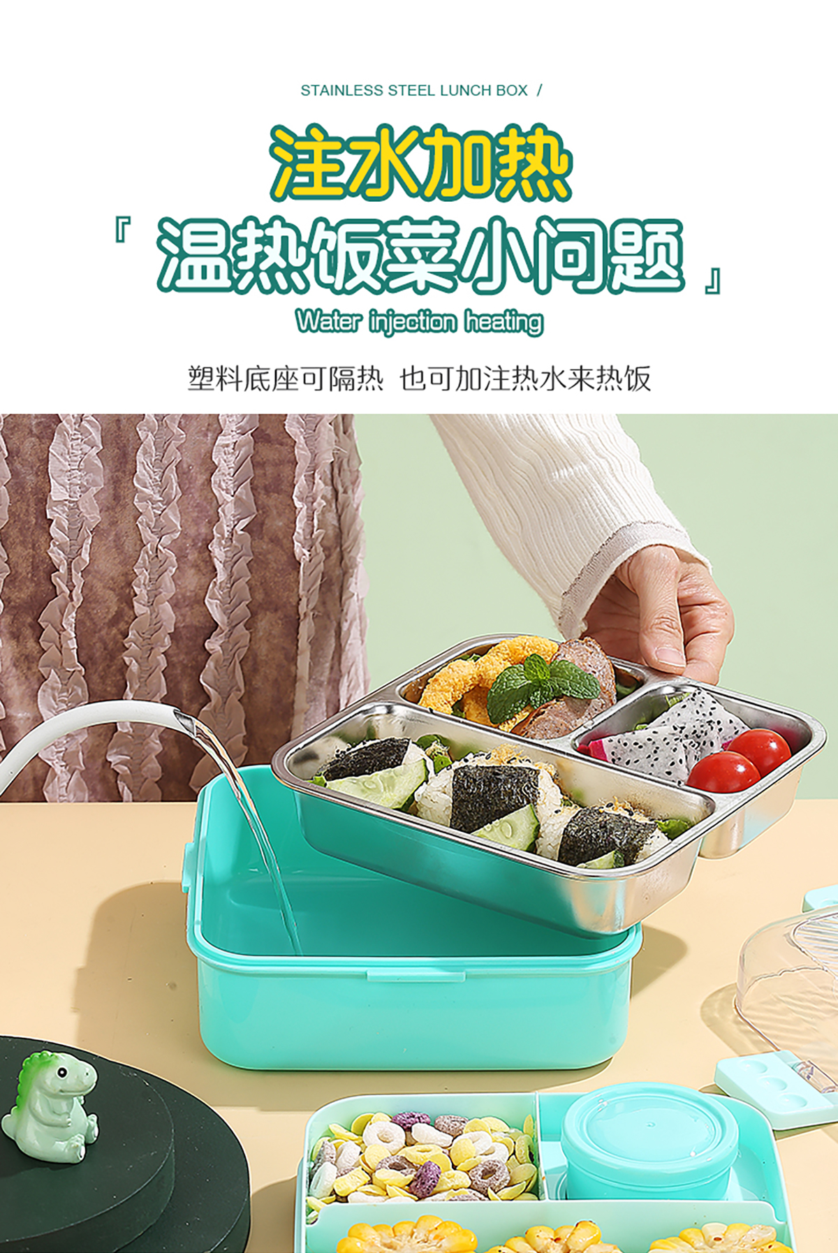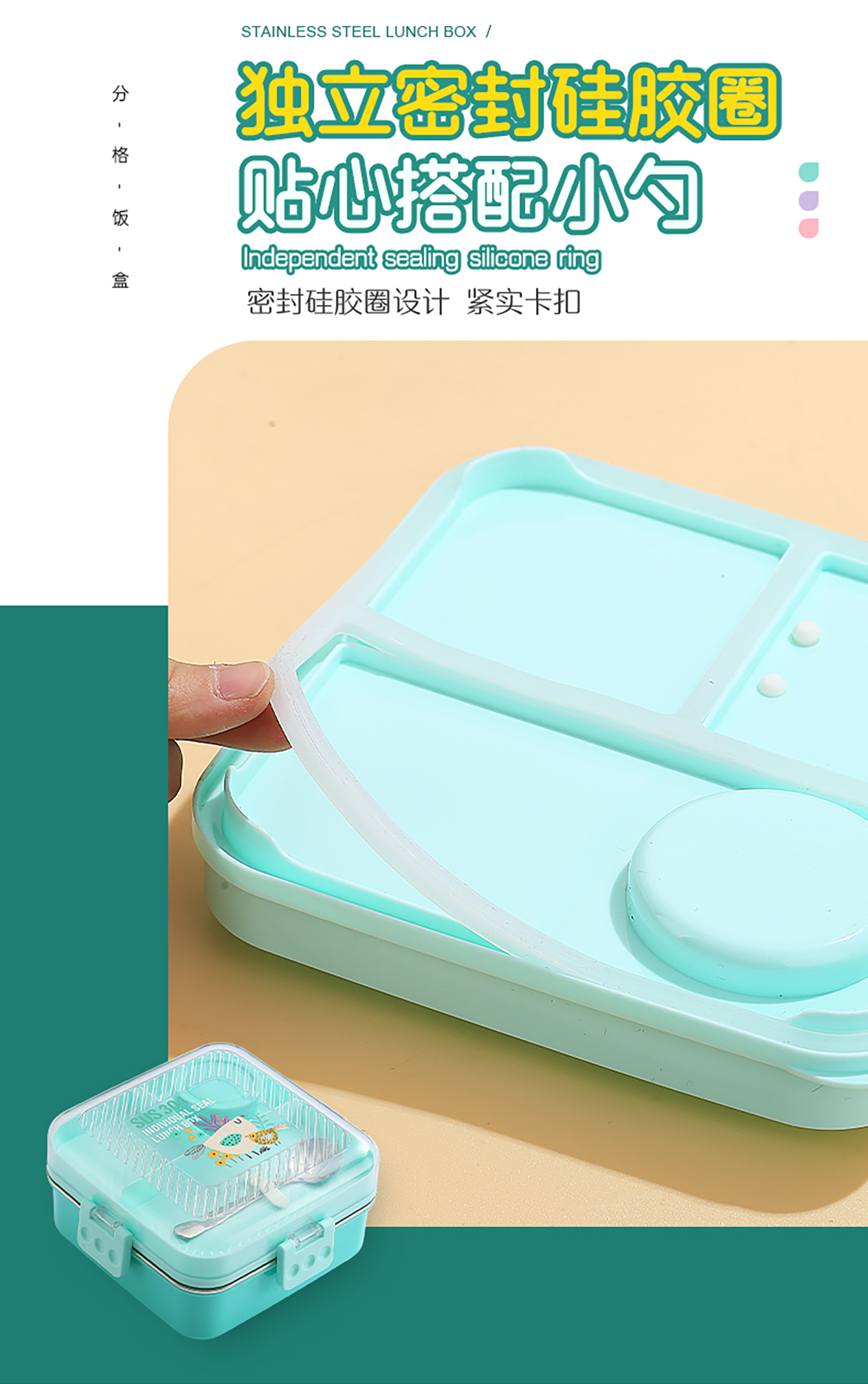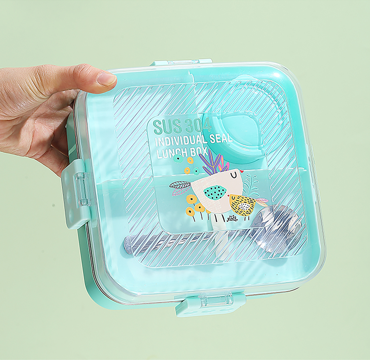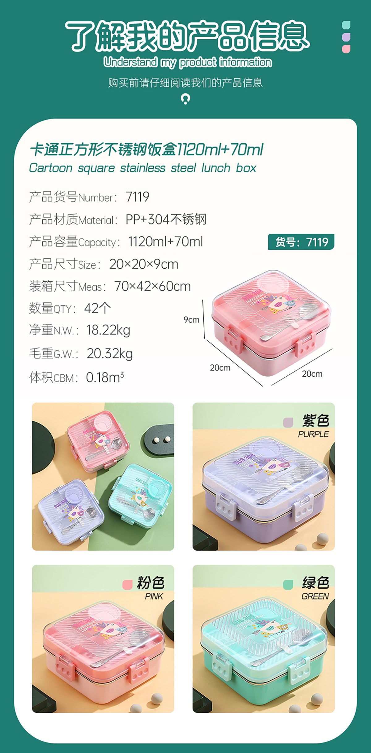 卡通正方形不銹鋼飯盒1120ml+70ml