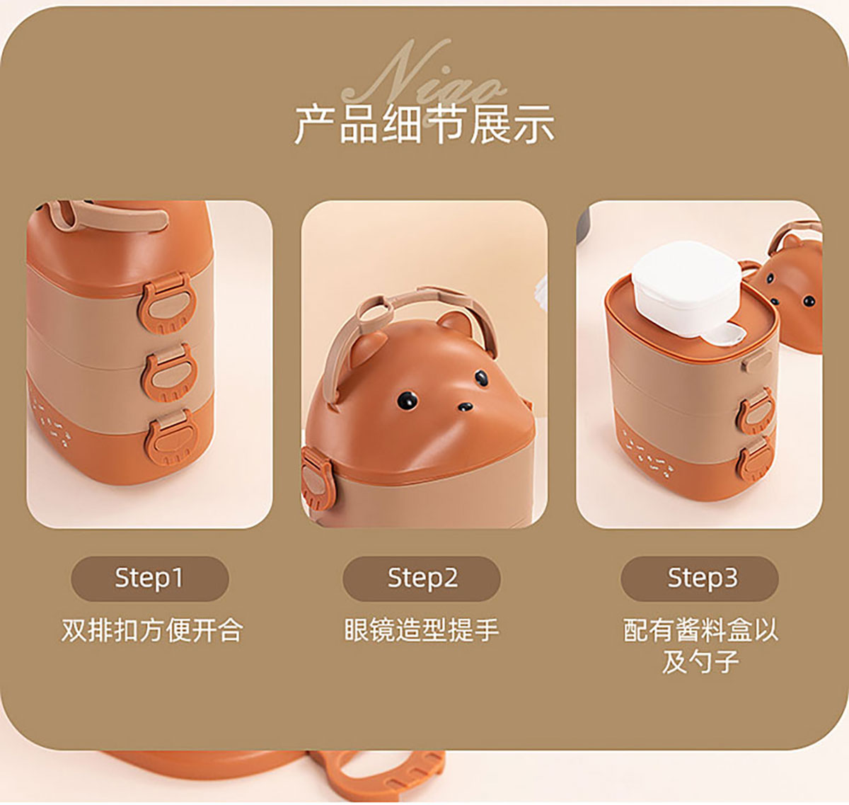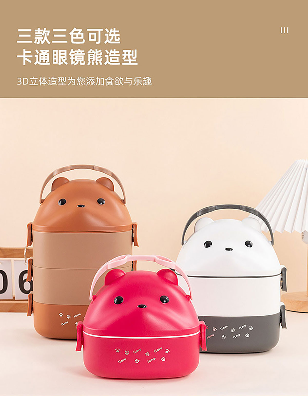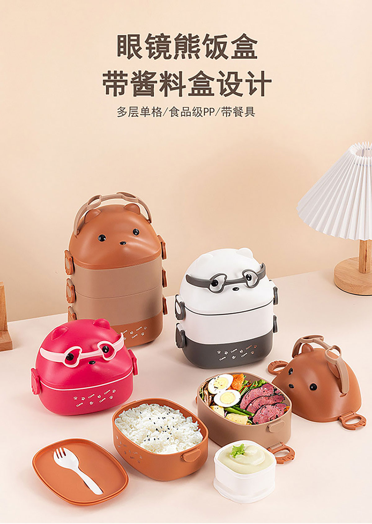 眼鏡熊長(zhǎng)方形單層/雙層/三層飯盒 (帶內(nèi)格)