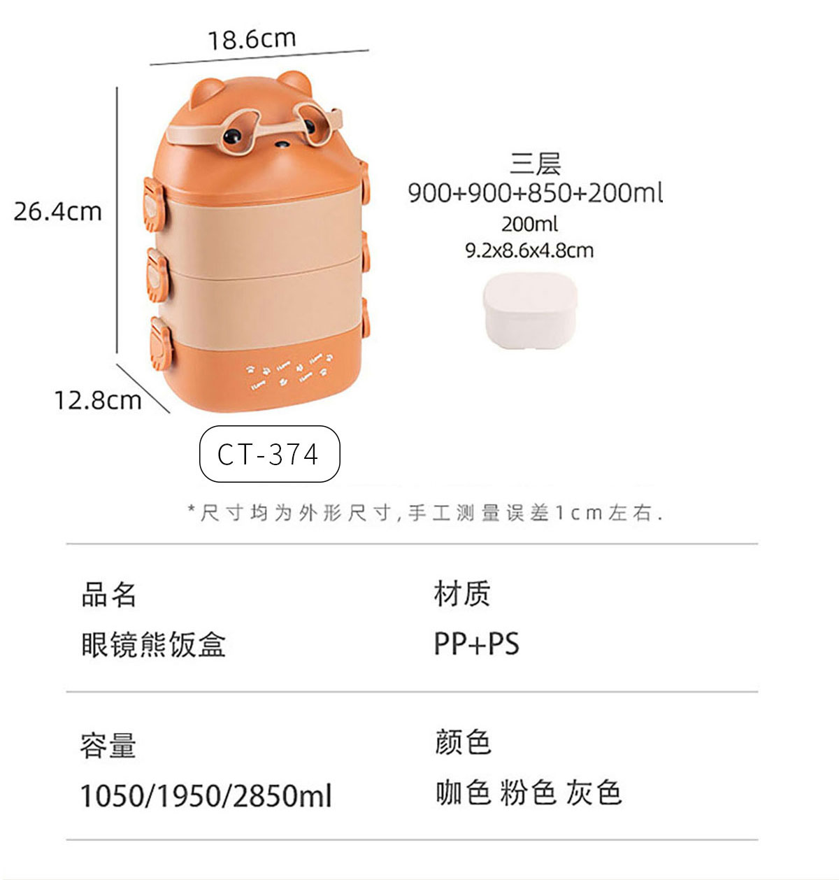 CT-374(三層):186*128*264mm/900+900+850ml 內(nèi)格:92*86*48mm/200ml