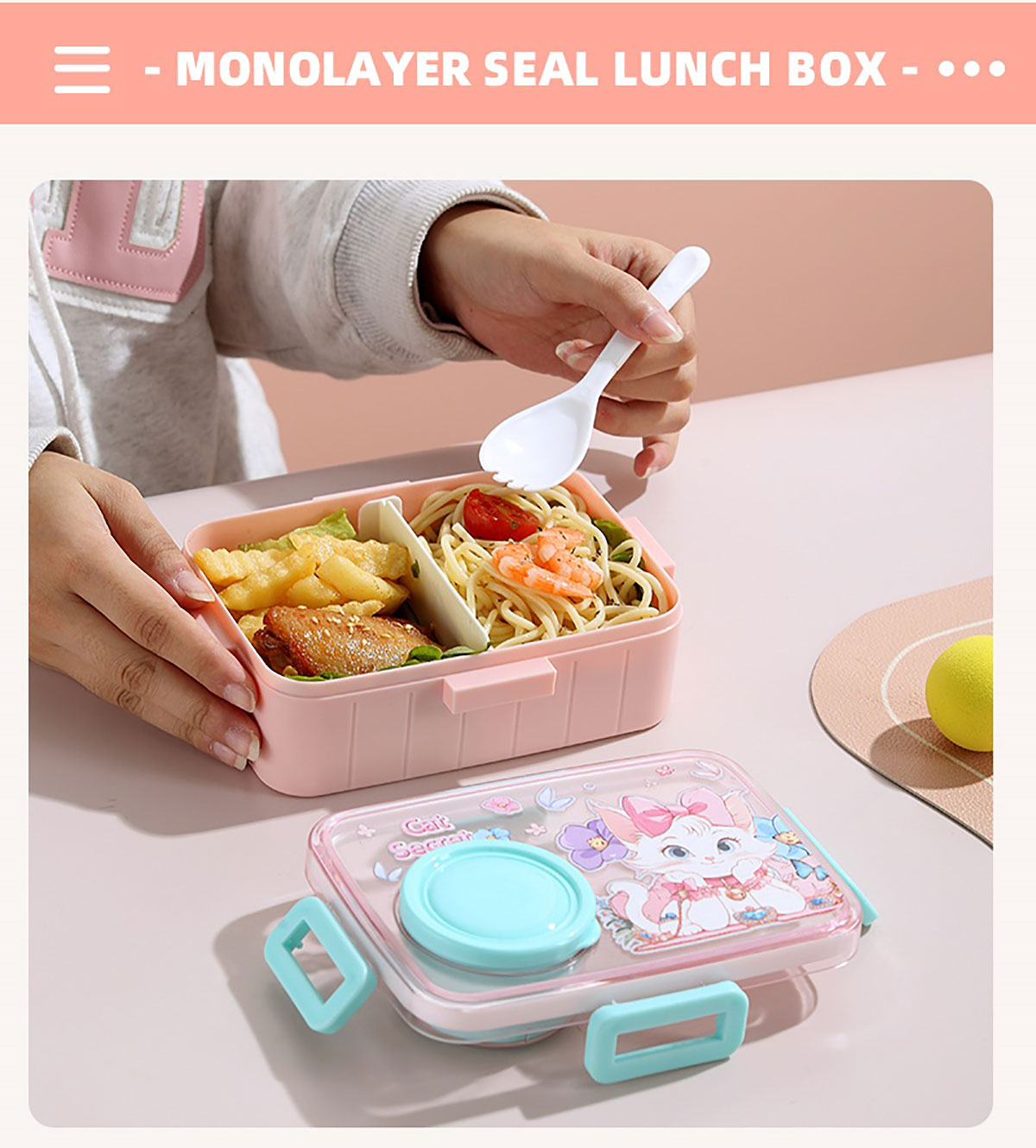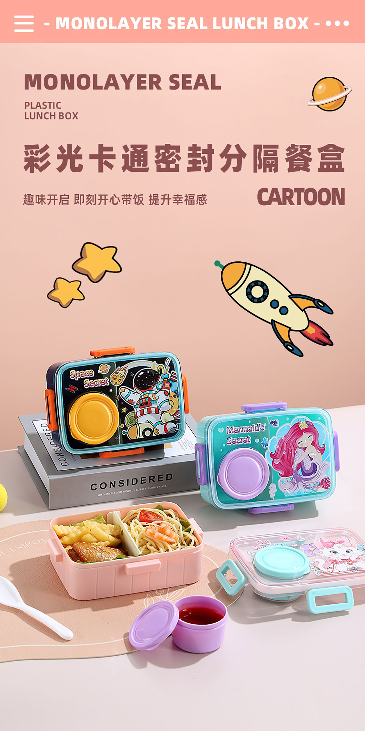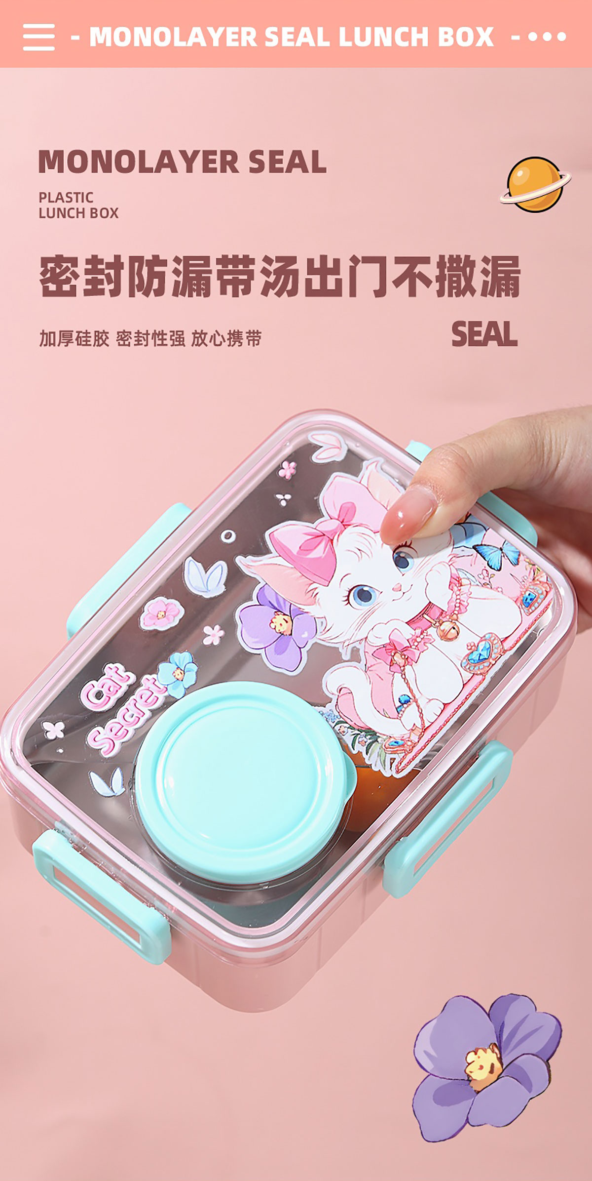 彩光卡通密封餐盒(單格600ml+外置醬料杯80ml+pp勺)