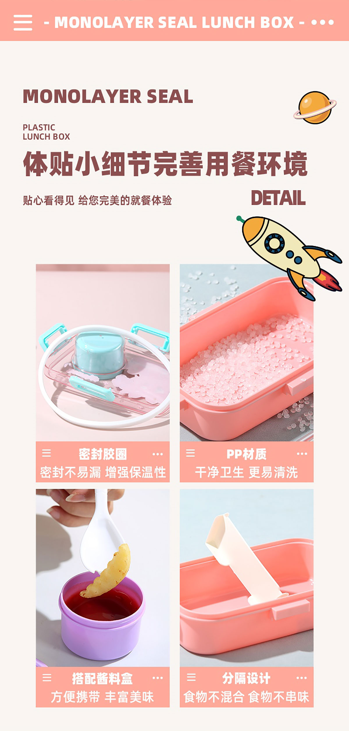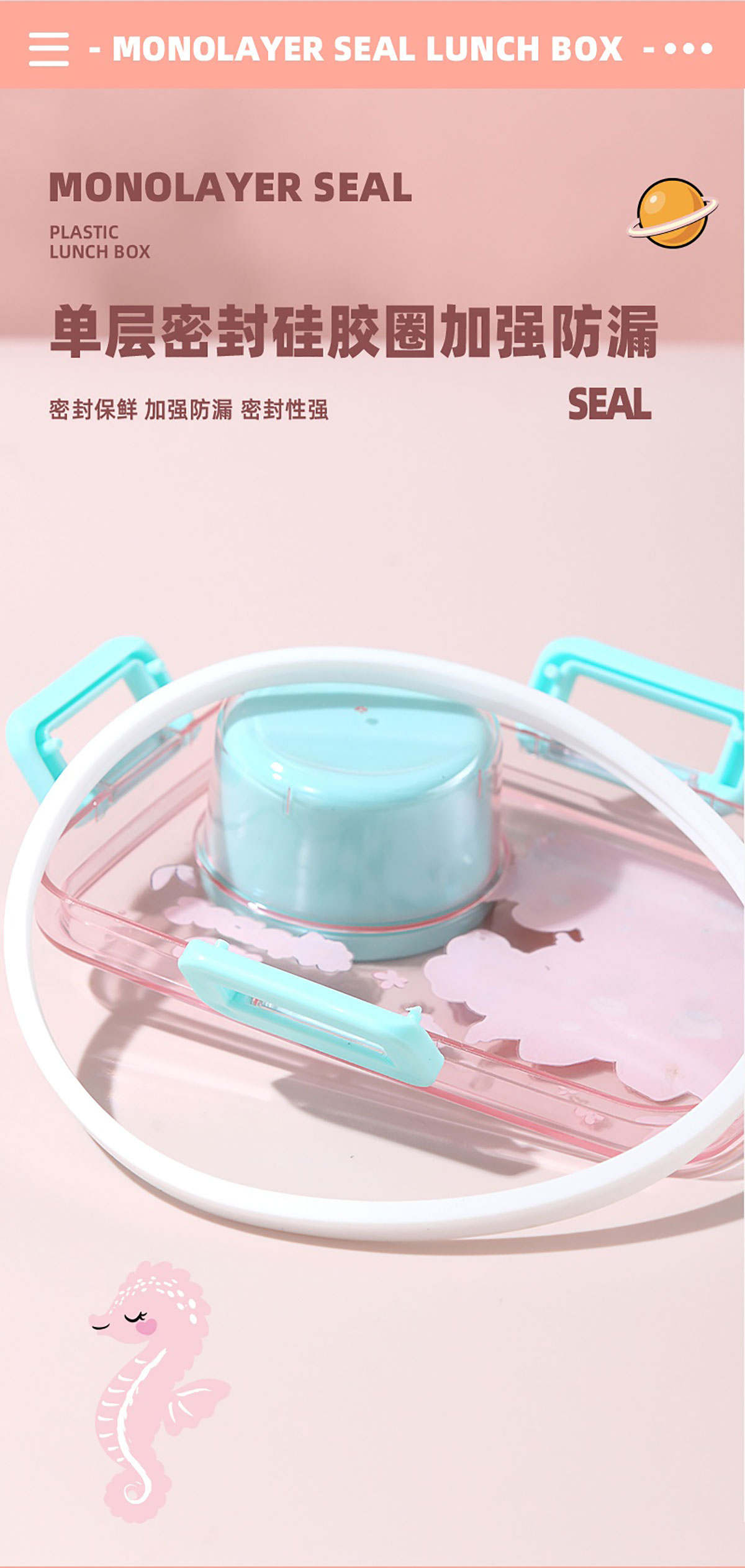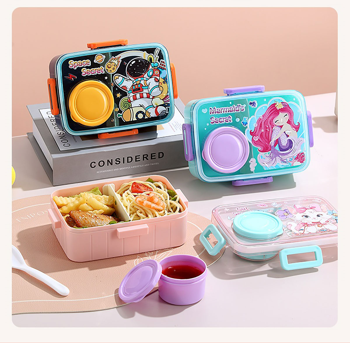 彩光卡通密封餐盒(單格600ml+外置醬料杯80ml+pp勺)