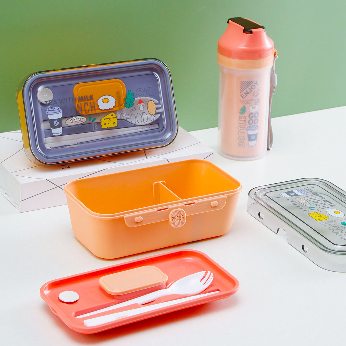 Size: 飯盒:210*120*70mm/1000ml 內(nèi)水壺:直徑78*180mm/400ml 外水壺:直徑78*142mm/500ml