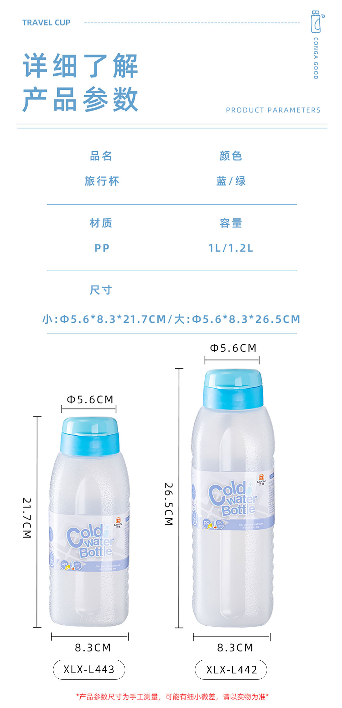 Size: XLX-L442(大號):Φ56*83*265mm/1.2L XLX-L443(小號):Φ56*83*217mm/1L